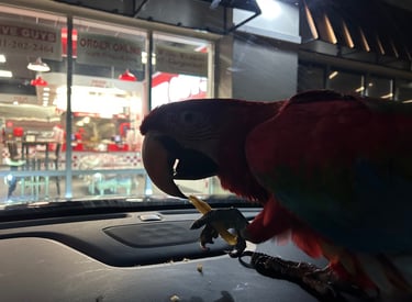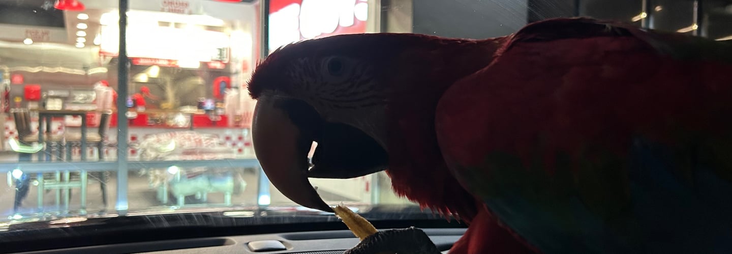 Wally is our one-year-old Greenwing Macaw. He loves going on walks with me and always draws a crowd. Because of that, I’ve met so many interesting people I might never have talked to if they hadn’t stopped to say hello to him.